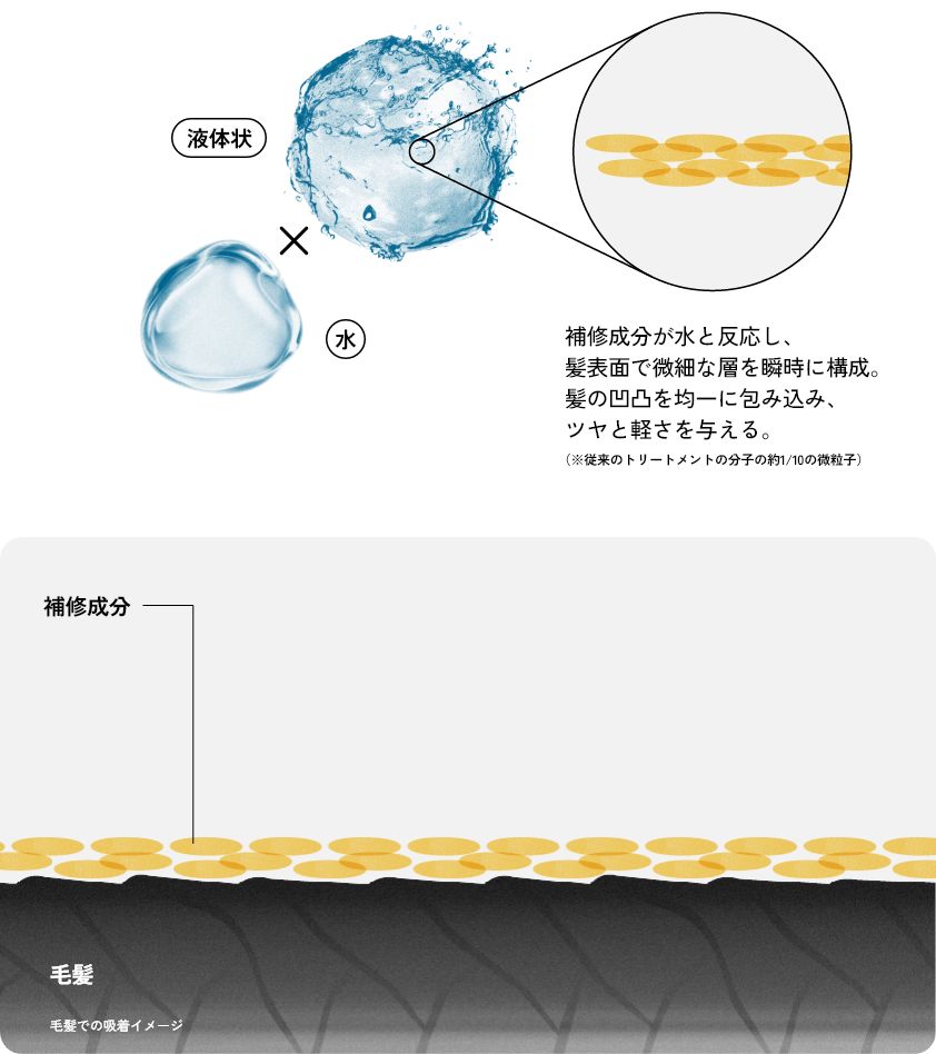 濡れた髪に塗布すると、補修成分が瞬時に水と反応し、